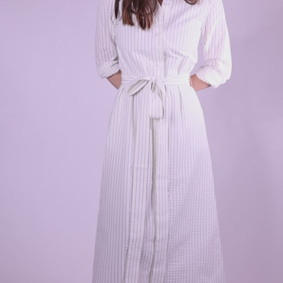 The Rachel dress is a classically tailored button-down shirt dress with a waist-defining cut and accentuated shoulders. It is made of lightweight cotton and features a self-tie belt. Color Ivory Stripe.