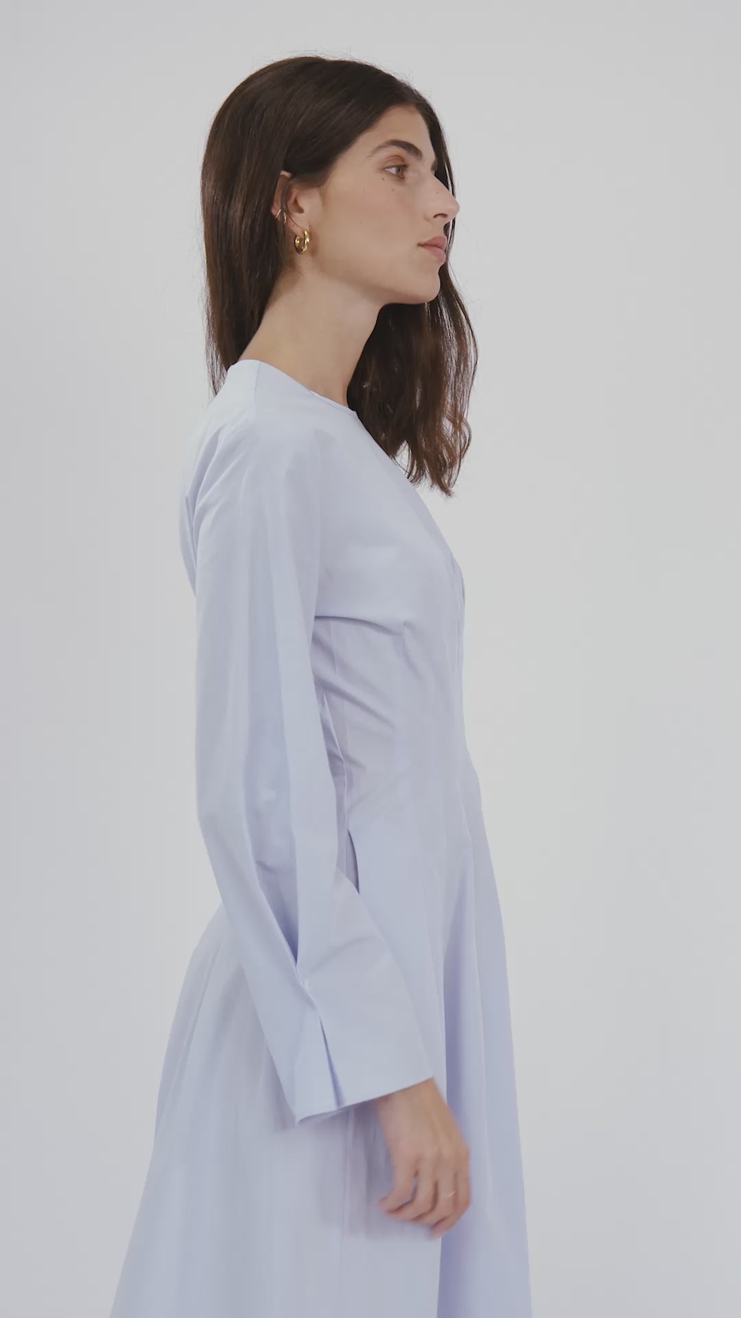The Natasha Dress in blue is a refined essential that blends crisp tailoring with understated elegance. Crafted from structured yet breathable cotton, this tailored midi silhouette features sculptural vertical pleats that elongate the frame while adding subtle texture and dimension.