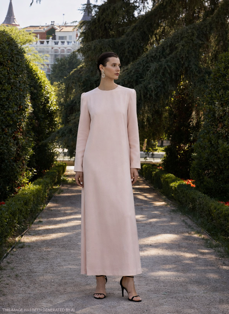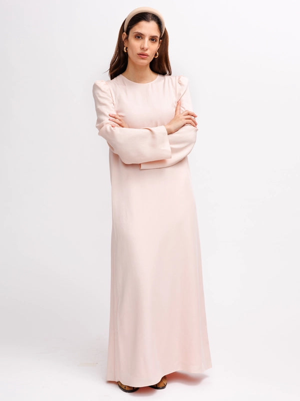 The Chaia Dress in soft pink embodies understated sophistication through a sleek, unstructured silhouette. Crafted from silky fabric with a subtle sheen, this long sleeve maxi dress falls in a clean straight cut that feels refined and modern.