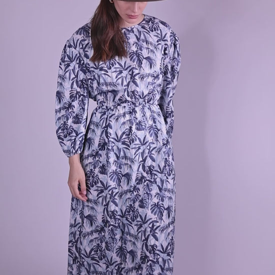 The Gila dress is a romantic and airy piece that captures timeless femininity. Crafted from lightweight cotton with a delicate floral print, this dress features long voluminous sleeves and a cinched waistline for a flattering silhouette. The soft pastel blue palette adds a dreamy touch, while the ruffled hemline creates a subtle, graceful movement. Color Dark Blue.