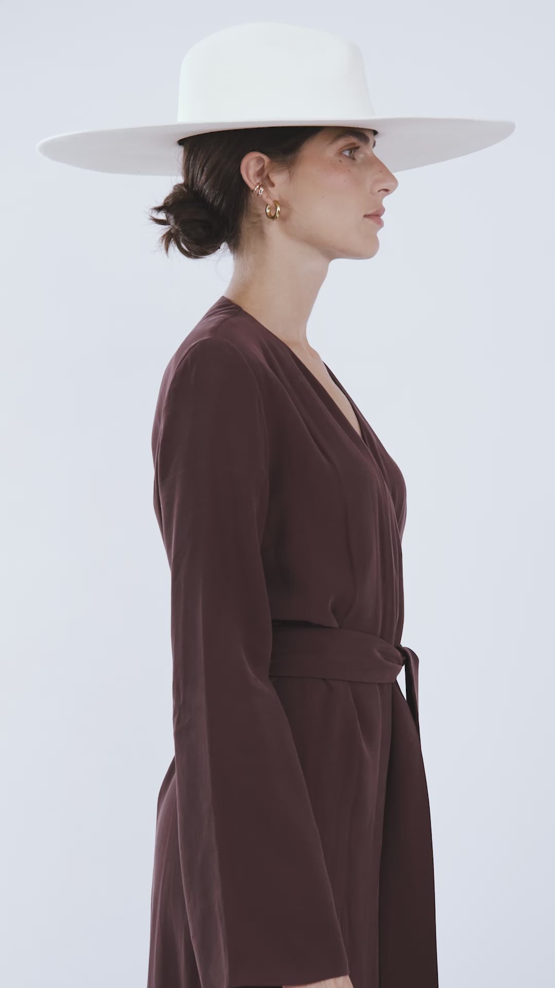 The Leah Dress in aubergine is crafted from silky satin, falling in a fluid wrap silhouette that embodies effortless elegance. Designed with a v cut neckline and strong, defined shoulders, this maxi wrap dress creates a confident and sculpted shape.